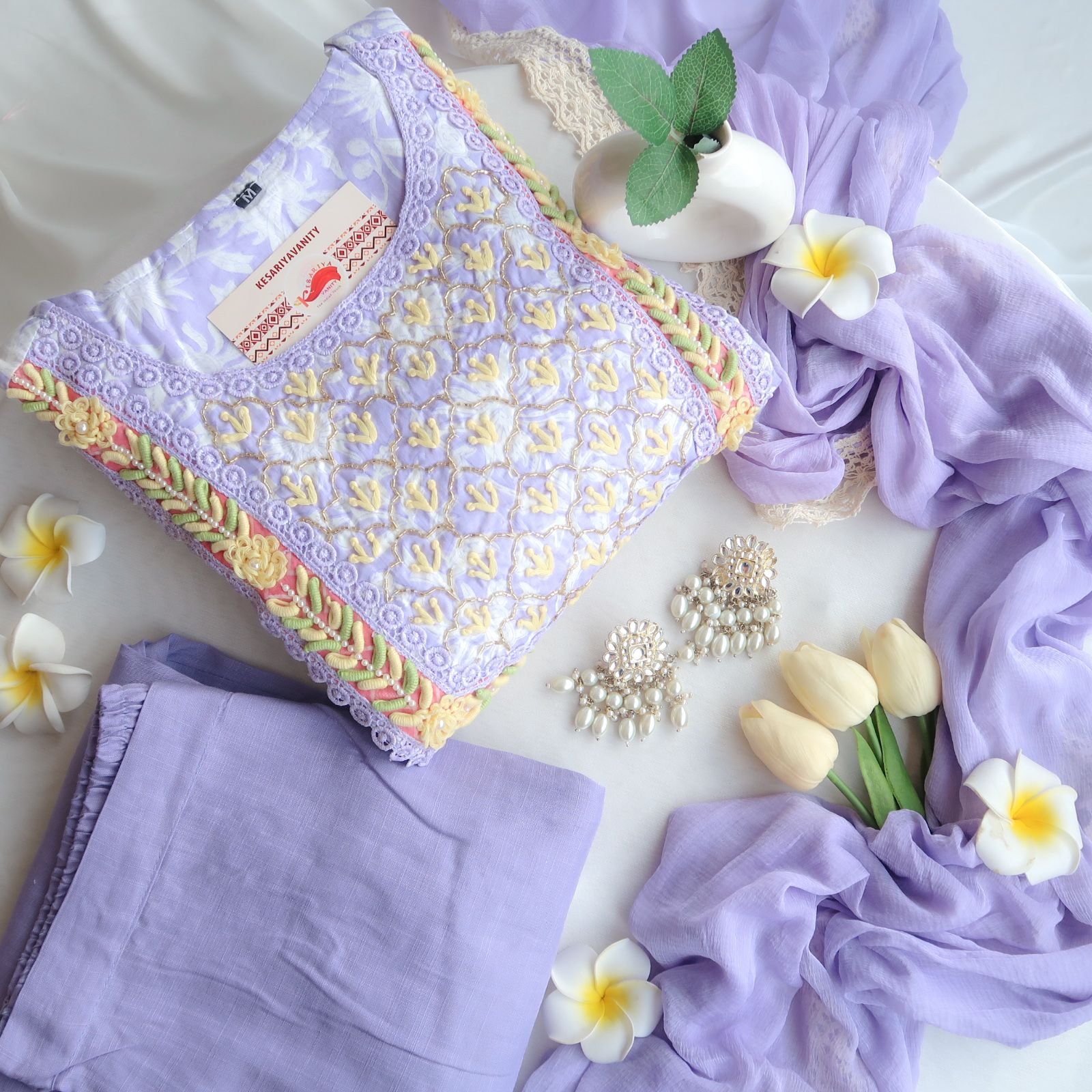 Paired with plain lavender straight-cut pants, the set ensures a balanced, refined look. The soft mulmul cotton dupatta in matching lavender is complemented by delicate white lace on the borders, adding a graceful touch to the ensemble. Ideal for festive celebrations and special occasions.