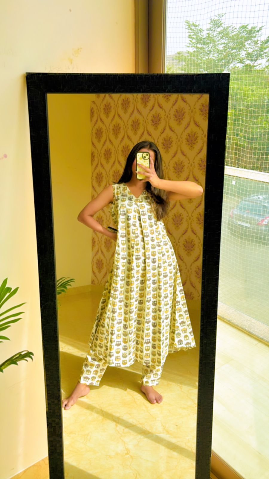 Step into the world of comfort and charm with our pure cotton comforter kurta pants sets, where style meets whimsy in every stitch. Our kurta, in a soft off-white hue, serves as the canvas for adorable brown and dark brown owl prints, adding a touch of playful elegance to your ensemble.