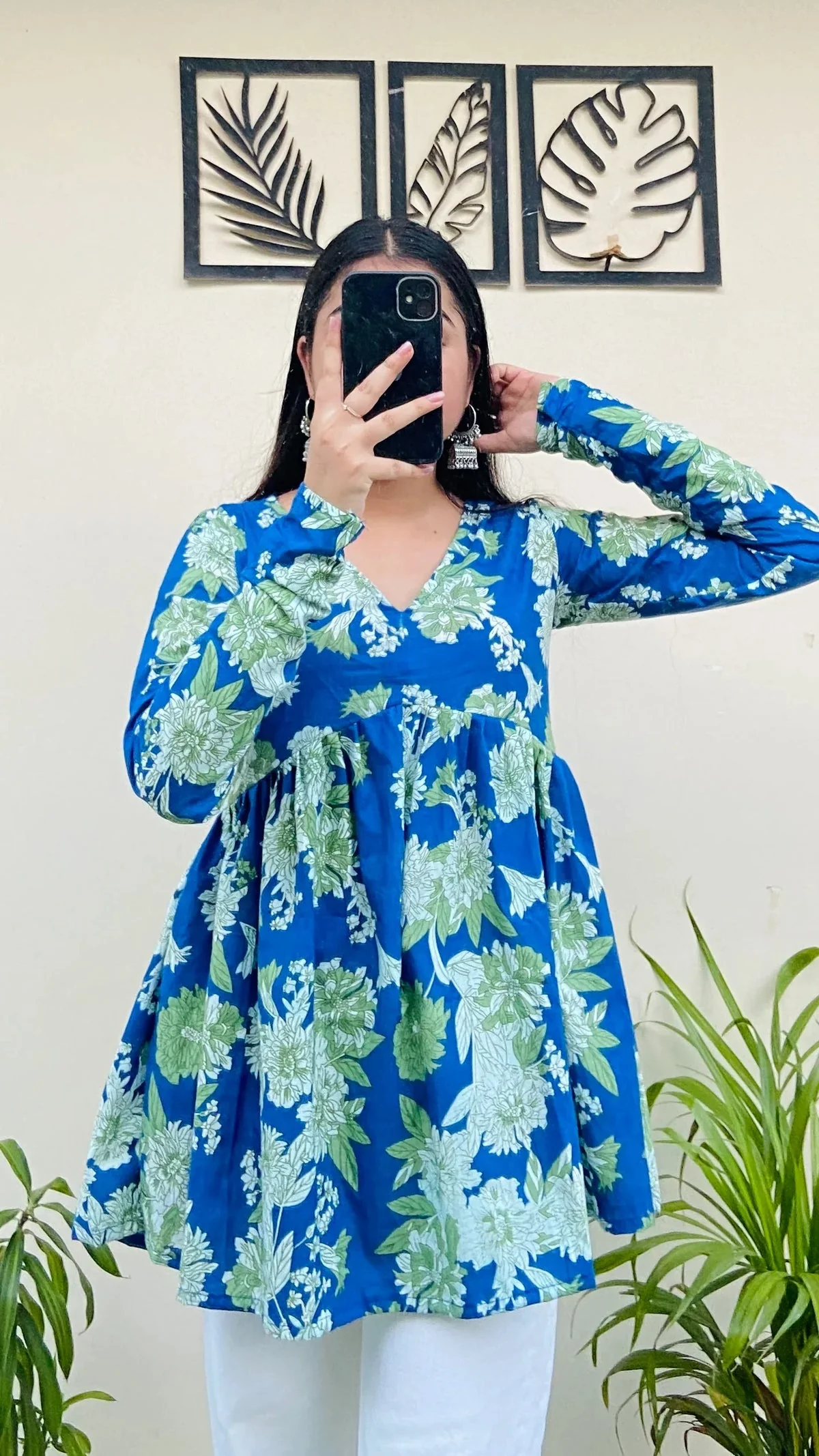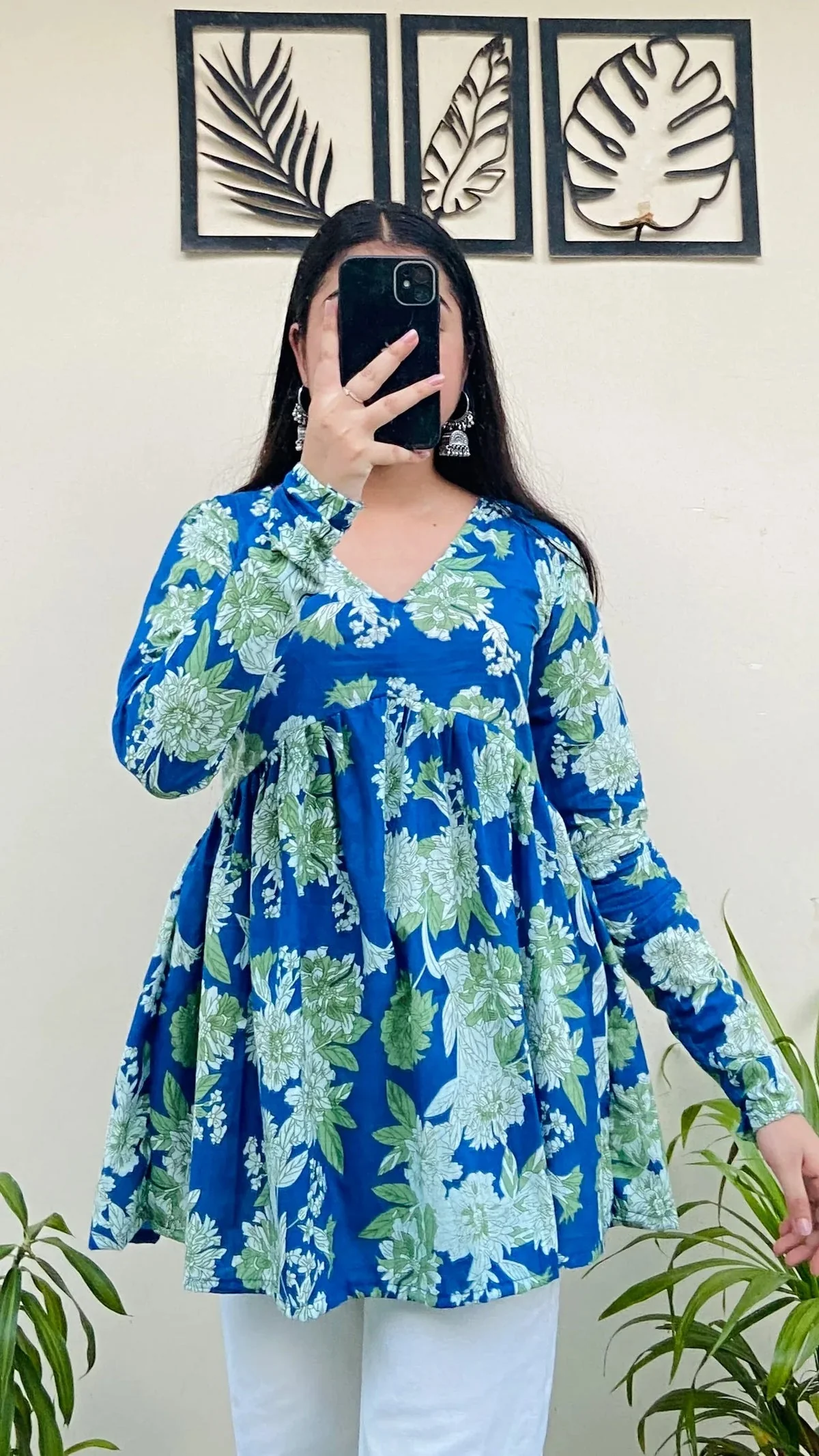 Cotton Flared Blue Printed Aliacut Peplum Top