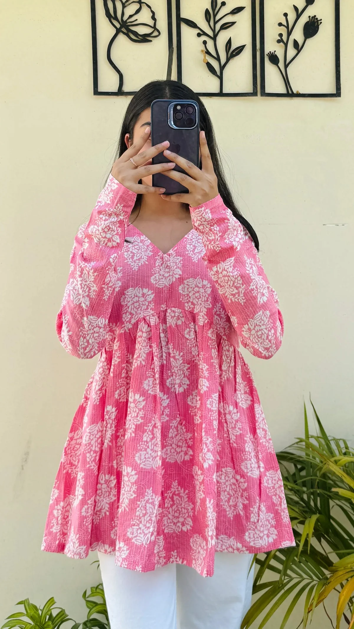 Cotton Katha Peach Printed Aliacut Peplum Top