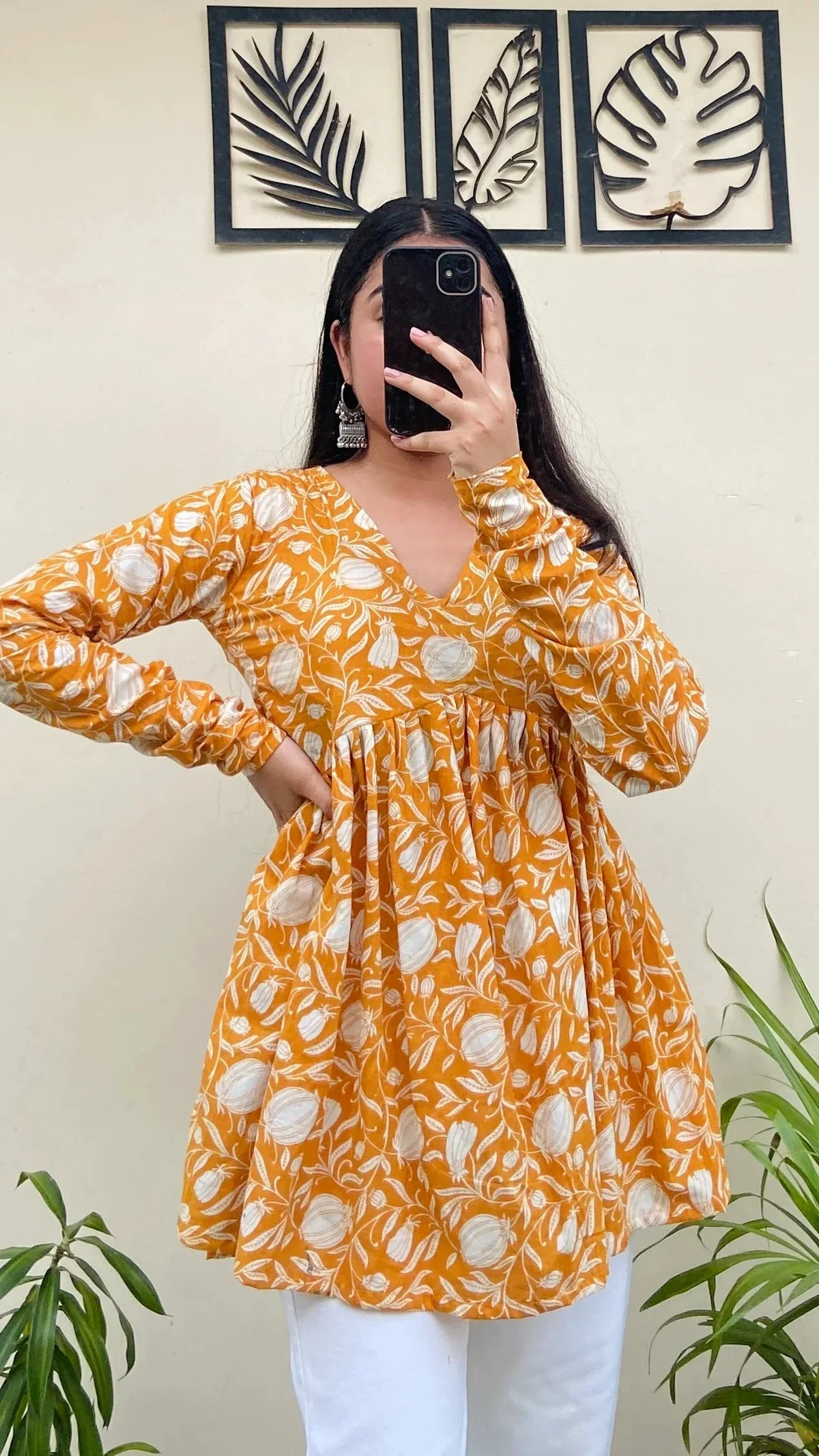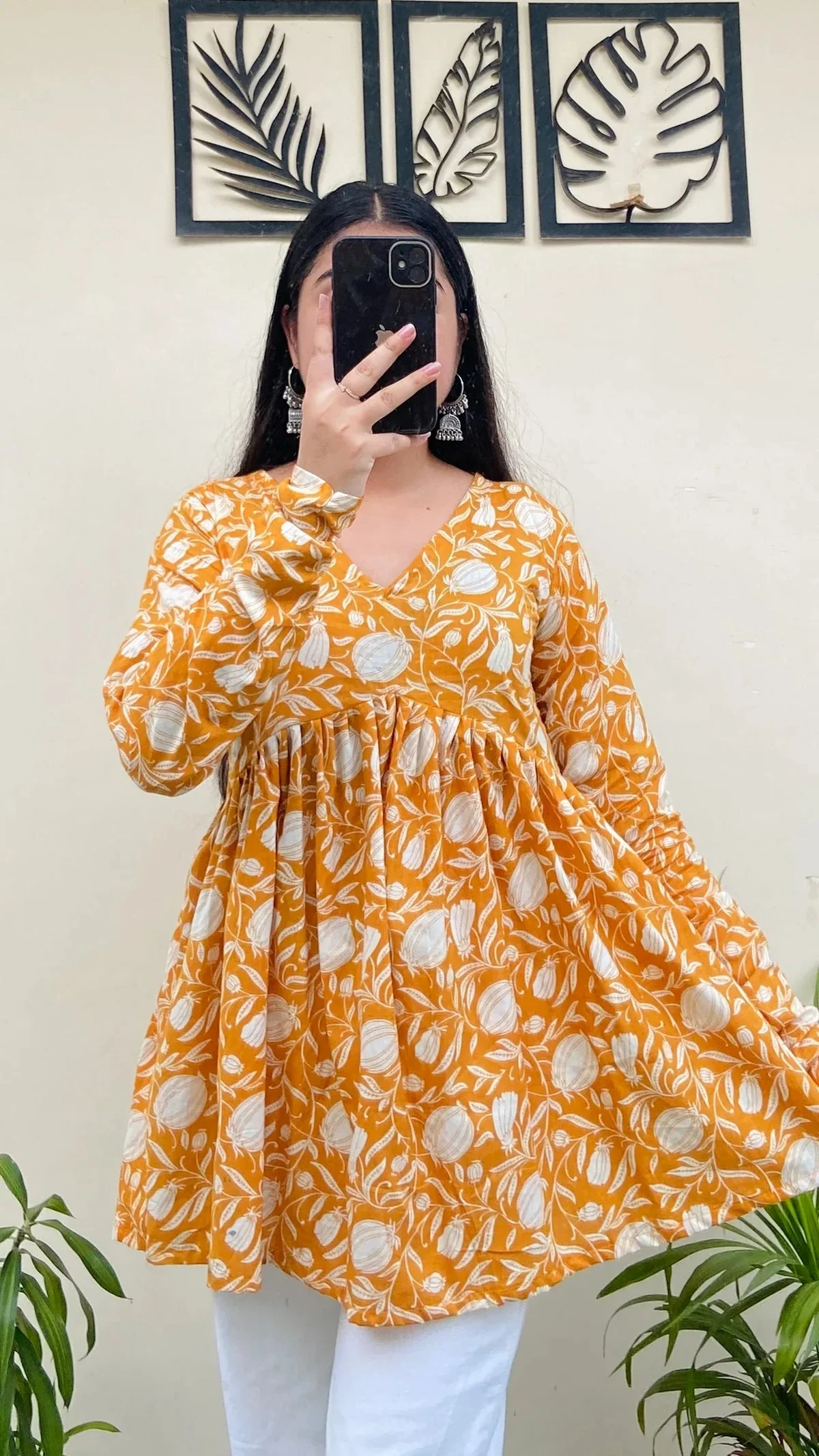 Cotton Yellow Flared Aliacut Floral Print Peplum Top